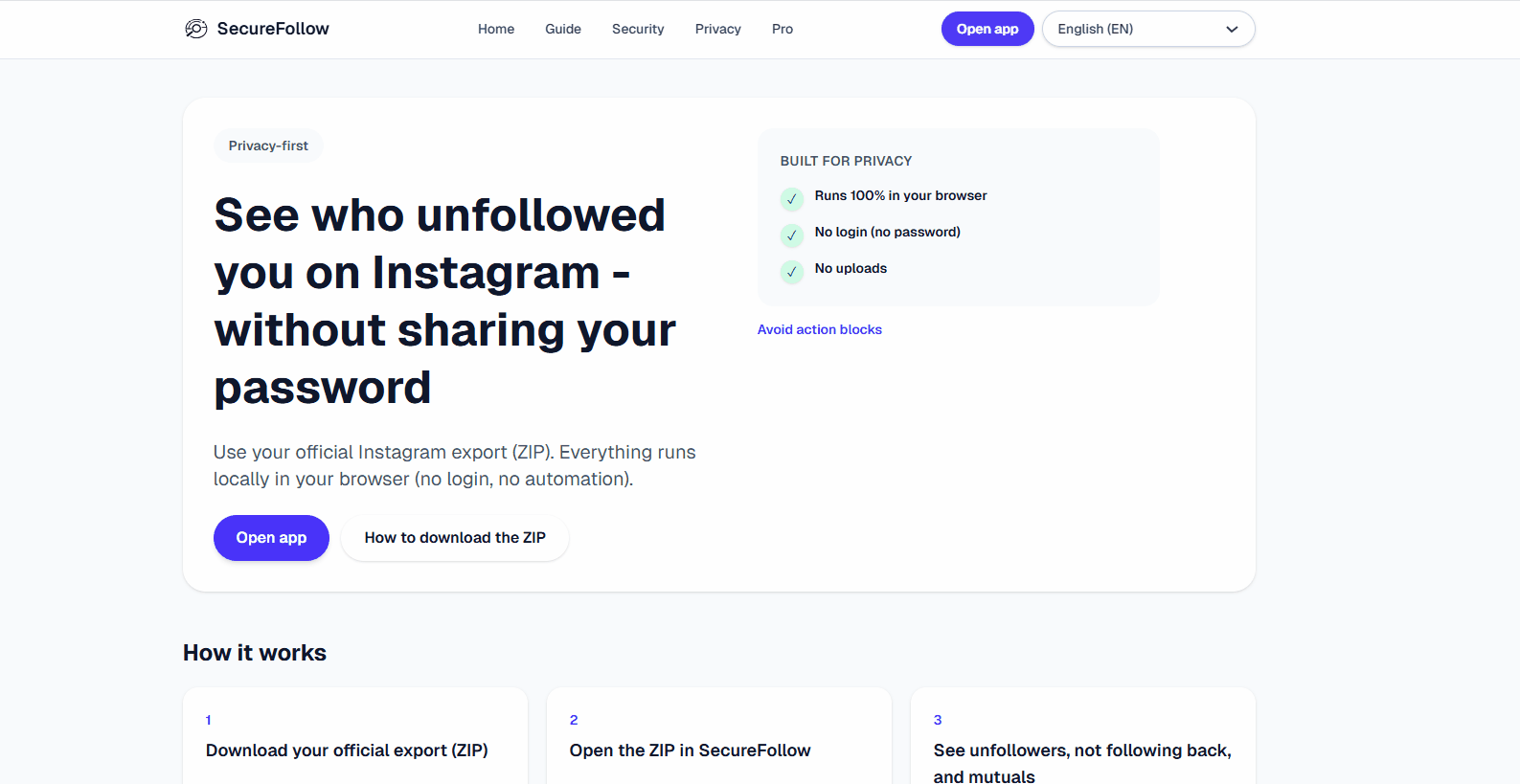 Use your official Instagram export (ZIP). On mobile, you can schedule recurring exports to cloud storage (e.g., Google Drive). Set it once, then import the latest export anytime. Built for very large exports (up to ~1.5M connections) — everything is processed locally on your device. Everything runs locally in your browser (no login, no automation). SecureFollow is a web app (securefollow.app). We never ask for your Instagram password.